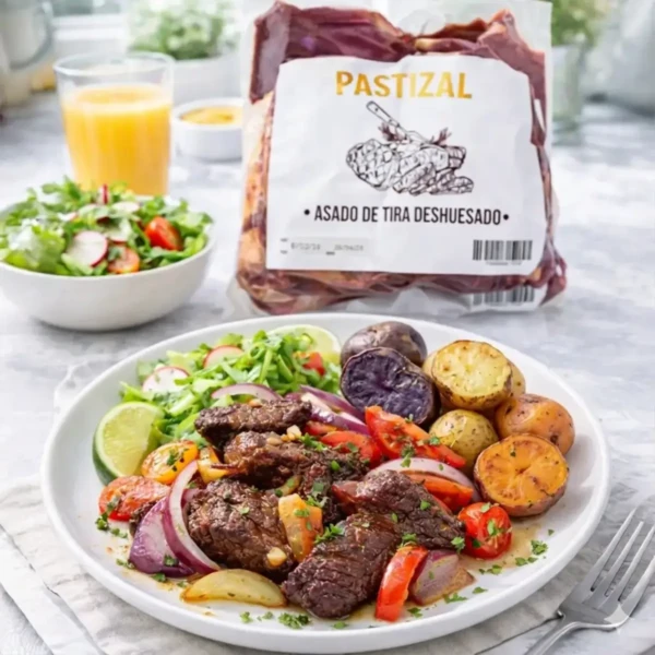 El asado de tira deshuesado de pastura es ideal para parrillas y asados. Su textura y sabor destacan gracias a la alimentación natural del ganado.