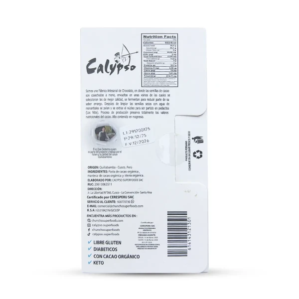 Ingredientes: pasta de cacao, manteca de cacao y stevia.